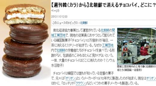 일본 산케이 신문은 10일 “북한에서 사라지는 초코파이, 어디로?”라는 제목으로 “개성공단에서 대량의 초코파이가 흔적도 없이 사라지고 있다”며 “하루 10만여개, 한 달에 250만여개의 초코파이가 암시장을 통해 고가에 거래되고 있다”고 보도했다.