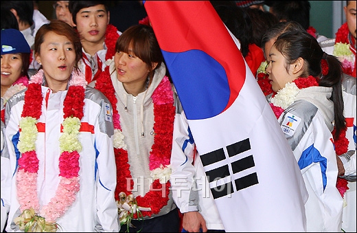 2010밴쿠버동계올림픽에서 역대 동계올림픽 출전 사상 최고의 성적을 낸 한국 선수단이 2일 오후 인천공항을 통해 입국했다. 금메달리스트 이상화는 네티즌들의 김연아와 미모를 비교하는 질문에 "나도 나만의 매력이 있다"며 재치있게 대답해 눈길을 끌었다. 기수로 태극기를 들고 지나가는 김연아(사진오른쪽)를 보고 있는 이상화(사진왼쪽)선수. 한국 선수단은 이번 동계올림픽에서 금메달 6개, 은메달 6개, 동메달 2개로 역대 최다 메달을 수확했고, 종합 순위에서도 동계올림픽 출전 사상 최고인 5위에 올랐다. 독자들의 PICK! 친구 아내와 바람난 남편...월 300만원 받고 방 잡아준 친구 제니, 50억 집도 사더니...용산 '200억' 건물 전액 현금 매입 배우 정은우, 돌연 사망 비보…하루 전엔 SNS에 장국영 사진 구준엽, 서희원 '400억 유산' 두고 장모와 갈등? 처제 입 열었다
