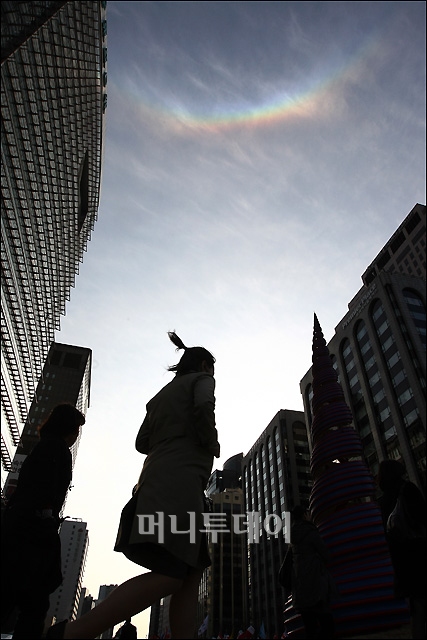 8일 오전 서울 청계광장의 쾌청한 하늘위로 거꾸로 뒤집어진 무지개가 떠 있어 출근길에 지나는 시민들의 눈길을 끌고 있다. 시간은 오전 8시 45분부터 9시15분까지 30여분간 모습을 보인 뒤 사라졌다.