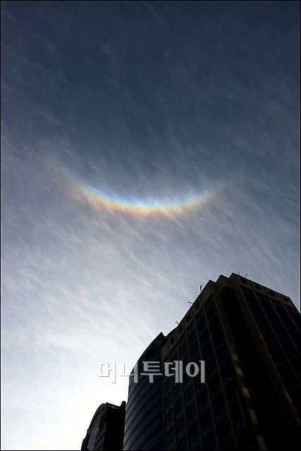 8일 오전 서울 청계광장의 쾌청한 하늘위로 거꾸로 뒤집어진 무지개가 떠 있어 출근길에 지나는 시민들의 눈길을 끌고 있다. 시간은 오전 8시 45분부터 9시15분까지 30여분간 모습을 보인 뒤 사라졌다.