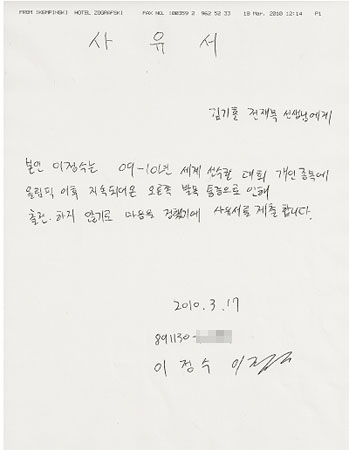 소피아 현지에서 이정수선수가 지도자에게 제출한 사유서에 의한 것입니다.