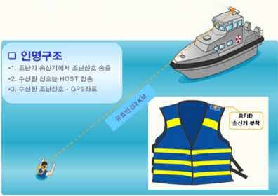 해양경찰청의 RFID 구명조끼는 조난자가 구명조끼에 부착된 송신기로 구조 요청을 하면, 수신시스템을 갖고 있는 함정에서 이를 수신, 조난자의 인적사항과 위치를 파악해 신속하게 구조활동을 펼칠 수 있게 해준다.