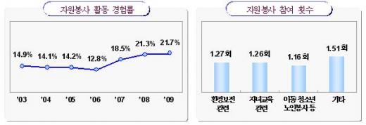 자원봉사활동 경험율도 지난해 21.7%로 매년 증가 추세다. 2006년 12.8%에서 8.9%p 상승했다. 경험자들의 분야별 평균봉사활동 횟수는 ‘환경보전 관련’(1.27회)과 ‘자녀교육 관련’(1.26회) 활동이 많았다.
