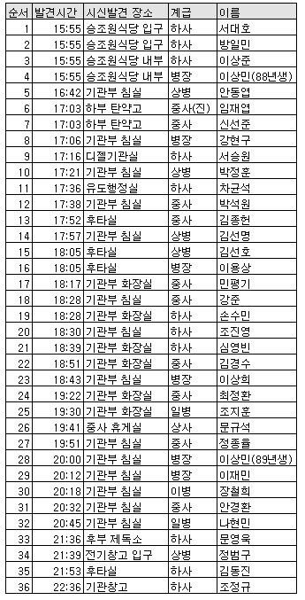 아래는 15일 밤 11시20분까지 시신이 발견된 천안함 장병들의 명단이다.