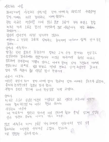 오씨는 편지에서 "꿈인지 생시인지 아직도 믿기지가 않는다"며 "예전에 그 건강한 모습으로 '엄마'하고 놀라키며 나타나 덥석 안아줄 것 같은데…"라고 말을 잇지 못했다.