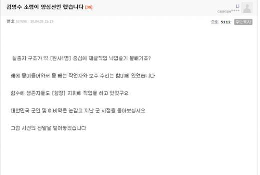 이 글을 '김영수 소령이 양심선언했습니다'는 제목으로 올리고 "국방부로부터 피해를 감수하고 진지하게 쓴 것"이라며 양심선언을 했던 해군장교를 사칭하기도 했다.