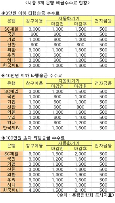3만 원 초과 10만 원 이하를 타행 송금할 경우 국민·우리·기업은행은 1000원의 수수료를 부과하지만 한국씨티은행은 이보다 두 배 많은 2000원을, 신한·외환·SC제일은행은 3배나 많은 3000원을 부과하고 있는 것으로 드러났다.