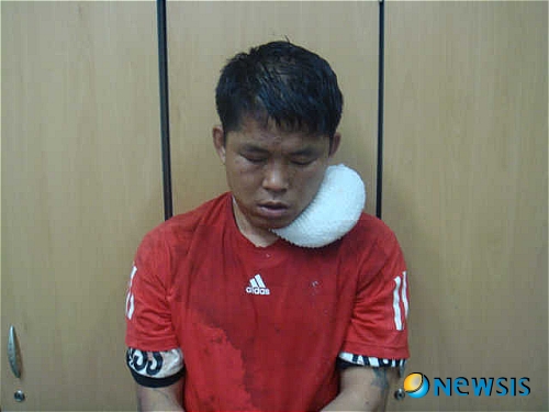 얼굴에 상처를 입고 목 부위에는 얼음찜질을 하고 있었다. 검거 당시 경찰과의 몸싸움과 자해 소동을 벌였기 때문이다.