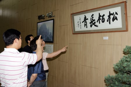 행정안전부는 김영삼 전 대통령이 친필 휘호를 보내왔다고 28일 밝혔다. 김 전 대통령은 맹형규 장관의 요청으로 특별히 휘호를 써 행안부에 전달한 것이라고 행안부는 설명했다. 휘호는 松栢長靑(송백장청, 소나무와 잣나무는 오래도록 푸르다)의 네 자로 김 전 대통령이 2005년 서울 서예 비엔날레에 출품하는 등 평소 좋아하는 문구로 알려져 있다. 행안부는 이 휘호를 직원들의 왕래가 가장 많은 1층 로비에 전시했다. 독자들의 PICK! "이제 즐길것"...입상 실패 미 국대, 팬과 '스파 데이트' 인증 "계산적" 주사이모, 박나래 전 매니저 저격에…"뭐가 그리 당당?" "성소수자 지인과 불륜"…최동석, 박지윤 상간소송 각하에 항소 '성범죄' 사촌오빠 결혼, 부모는 쉬쉬..."예비 새언니에 알릴까요"