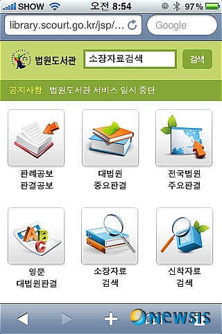 법원도서관(관장 강영호)은 대법원과 전국 법원의 중요한 판례나 판결 정보를 스마트폰으로 열람하게 하는 모바일 홈페이지를 개설, 지난주부터 가동 중이라고 27일 밝혔다.
