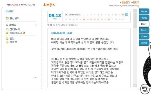 앞서 최씨는 미니홈피에 "강코와 강코회사의 대표가 데리고 나온 조직폭력배들에게 협박을 당했으며 맞고소로 형사고소를 할 예정"이라는 장문의 글을 올렸다.