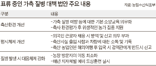 농식품부에 따르면 올해 축산업 종사자 2만여 명이 해외여행을 다녀온 것으로 집계됐다. 이 중 당국에 신고하고 소독 절차를 거친 사람은 1만4000여 명에 그쳤다. 나머지는 귀국 후 별다른 방역절차 없이 축사로 들어갔다. 이 과정에서 소와 돼지가 바이러스에 감염된 것으로 방역 당국은 보고 있다. 익명을 원한 농식품부 관계자는 “출입국관리소의 협조를 받아 여행 사실 확인은 했지만 법적 근거가 없어 방역 절차까지 강제할 수는 없었다”고 말했다. 법이 빨리 통과됐다면 막을 수도 있었다는 얘기다.