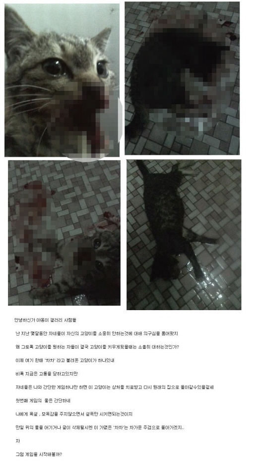 지난 9일 오후 인터넷 커뮤니티 '디시인사이드-고양이갤러리'에 '캣쏘우(Catsaw)'라는 닉네임의 한 네티즌이 어린 고양이 '차차'를 잔인하게 학대한 사진 4장을 공개해 충격을 주고 있다.