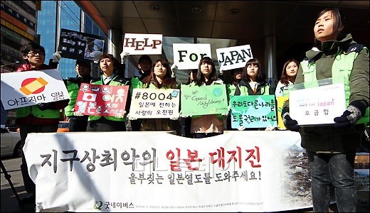 굿네이버스 자원봉사동아리 '인하브로드' 학생들이 17일 오전 서울시 중구 명동역 앞에서 일본 대지진으로 피해를 입은 이재민들을 위한 모금 캠페인을 벌이고 있다.