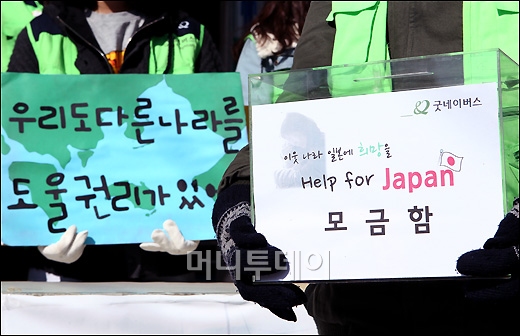 굿네이버스 자원봉사동아리 '인하브로드' 학생들이 17일 오전 서울시 중구 명동역 앞에서 일본 대지진으로 피해를 입은 이재민들을 위한 모금 캠페인을 벌이고 있다. 독자들의 PICK! "옆방서 불륜" 남편의 내연녀는 '엄마'...여배우, 20년 절연 고백 "'음주 뺑소니' 지상렬이 대리운전 모델?" 26년 전 사건 파묘 "남친에 4억 뜯겨" 여배우 충격에...은둔 생활→고깃집 서빙 "남경주, 애처가·딸바보였는데"…성폭행 혐의 '충격'