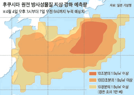 일본 후쿠시마(福島) 제1원자력발전소에서 방출된 방사성물질이 방출되면 이틀 정도 뒤엔 제주도와 부산 등 한반도 남부지방이 방사능 영향권에 들어가게 되는 것으로 나타났다. 일본 기상청이 5일 홈페이지에 공개한 방사능 확산예측 정보에서다. 이는 최근 한반도 일대에서 검출되고 있는 방사성물질이 지구를 동쪽으로 한 바퀴 돌든지 북극권을 거쳐 왔을 것이라는 지금까지의 한국 기상청 설명과는 다른 것이다.