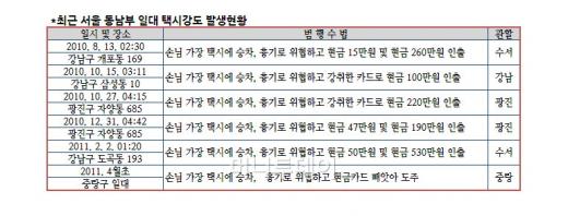 한편 지난달 8월부터 최근까지 8개월간 서울 동남부 일대에서 발생한 택시강도 사건은 6건으로 광진구 2건, 강남구 3건, 중랑구 1건이다. 6건의 택시강도 사건에서 인명 피해는 없었지만, 피해액은 1400여만원에 달하고 시민들과 택시기사들이 불안에 떠는 등 파장이 만만치 않은 상태다.