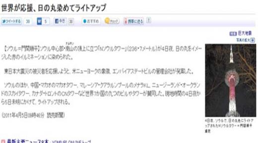 이 매체는 "동일본 대지진의 이재민을 응원하고자 미국 뉴욕의 상징 엠파이어스테이트 빌딩을 관리하는 회사가 발안했다"며 "서울뿐만 아니라 중국 마카오타워, 뉴질랜드 오클랜드 스카이타워, 캐나다 토론토의 CN타워 등 세계 7개국의 타워가 동참했다"고 설명했다.