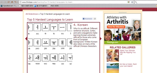 미국 육아전문 뉴스 웹사이트 서드에이지(Third Age·http://www.thirdage.com/learning/top-5-hardest-languages-to-learn)는 16일 영미 국가 사람들이 '배우기 어려운 언어 5'에서 한국어를 4위에 올렸다. 1위는 아랍어, 2위는 중국어, 3위는 일본어를 들었다.