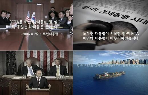 이 한미FTA 광고는 '노무현 대통령이 시작한 한미FTA, 이젠 이명박 대통령이 마무리 하겠습니다'는 내용과 함께 지난 1997년 노 전 대통령의 한미FTA협상 당시 사진과 동영상이 삽입돼 있다. 또 광고 마지막 부분에는 "한미FTA는 정파나 이데올로기의 문제가 아니다"라는 문구와 이명박 대통령의 미국 국회 연설장면으로 구성되어 있다.