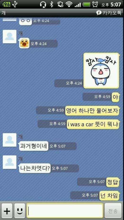 최근 한 커뮤니티에는 '창의적 이별선고'란 제목으로 카카오톡(스마트폰 메신저)을 주고받은 채팅방의 캡처 사진 한 장이 올라왔다. 한 사람이 "뭐 하나만 물어보자"며 "I was a car 뜻이 뭐냐"고 묻는다. 상대방은 "과거형이네"라며 "나는 차였다?"라고 답한다. 이에 물어본 이는 "정답. 넌 차임"이라고 이별을 고한다.