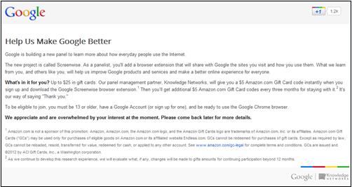 구글은 자사의 홈페이지를 통해 패널 참가자들에게 자신의 프라이버시를 넘기는 대신 5달러 상당의 아마존닷컴 상품권을 지급하겠다고 밝혔다. 이뿐만 아니라 최고 1년까지 3개월에 한번씩 5달러를 추가로 지급하겠다고 전했다.
