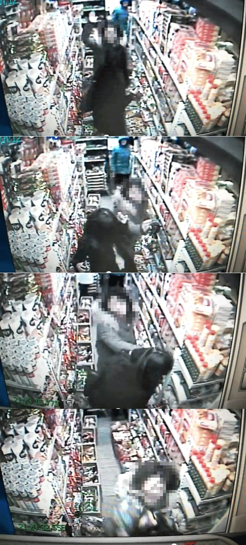 곧이어 여성이 슈퍼마켓에 들어와 갑자기 여고생의 머리와 얼굴을 4~5대 때리며 욕을 퍼붓고 돌아서다가다시 여고생에게 다가와 들고 있던 가방을 들고 여고생을 마구 때렸다.