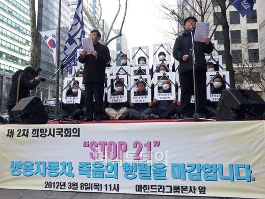 8일 오전 11시쌍용자동차(3,375원 ▼55 -1.6%)의 사무실이 있는 서울 강남구 역삼동 풍림빌딩 앞. 쌍용차 대규모 정리해고 문제해결을 위한 ‘희망시국회의 스톱(STOP)21’ 집회가 열렸다.