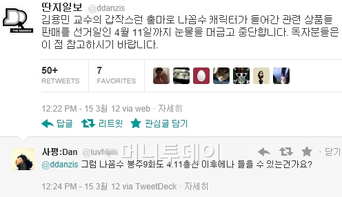 인터넷 팟캐스트 ‘나꼼수’를 제작하는 ‘딴지일보’가 지난 15일 공식 트위터를 통해 "김용민 교수의 갑작스런 출마로 나꼼수 캐릭터가 들어간 관련 상품 판매를 선거일인 4월 11일까지 눈물을 머금고 중단합니다. 이 점 참고하시기 바랍니다"라고 밝혀 눈길을 끌었다. 공직선거법을 지키기 위해서라는 것이다. 중앙선거관리위원회(이하 선관위)에 따르면 후보자의 얼굴이나 캐릭터가 들어간 상품을 판매, 배포하는 행위는 공직선거법에 저촉된다.