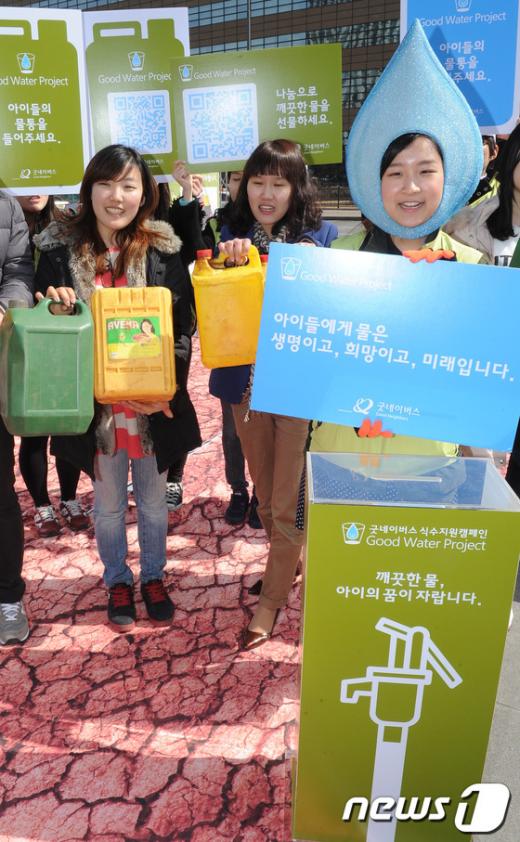 '3.22 세계 물의 날'을 하루 앞둔 21일 오전 서울 광화문광장에서 국제구호개발 NGO 굿네이버스 회원들이 아프리카 현지 아동들이 사용하는 식수통을 들고 식수의 중요성을 알리는 캠페인을 하고 있다. 이번 캠페인은 물 부족 및 오염된 물로 고통받는 저개발국 주민들의 어려운 실상을 알리기 위해 마련됐고, 캠페인을 통해 마련된 후원금은 굿네이버스의 말라위 지부를 통해 현지 아동들을 위한 우물 건립 기금으로 사용될 계획이다.