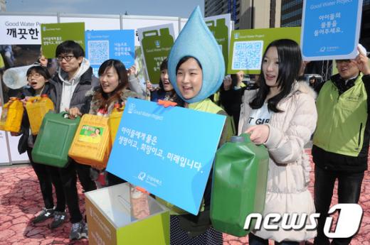 '3.22 세계 물의 날'을 하루 앞둔 21일 오전 서울 광화문광장에서 국제구호개발 NGO 굿네이버스 회원들이 아프리카 현지 아동들이 사용하는 식수통을 들고 식수의 중요성을 알리는 캠페인을 하고 있다. 이번 캠페인은 물 부족 및 오염된 물로 고통받는 저개발국 주민들의 어려운 실상을 알리기 위해 마련됐고, 캠페인을 통해 마련된 후원금은 굿네이버스의 말라위 지부를 통해 현지 아동들을 위한 우물 건립 기금으로 사용될 계획이다.