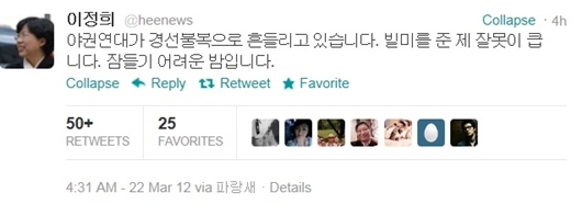 이 대표는 22일 새벽 4시쯤 자신의 트위터(@heenews)에 "야권연대가 경선불복으로 흔들리고 있습니다. 빌미를 준 제 잘못이 큽니다. 잠들기 어려운 밤입니다"라는 글을 남겼다.