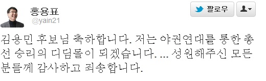 김 후보의 야권단일화 경선 상대였던 통합진보당 홍용표 후보(@yain21)도 트위터에 "김용민 후보님 축하합니다. 저는 야권연대를 통한 총선 승리의 디딤돌이 되겠습니다. 성원해주신 모든 분들께 감사하고 죄송합니다" 라는 글을 올리며 경선 승복 의사를 밝혔다.