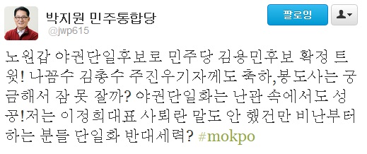 김 후보의 경선 승리 소식이 알려지자 민주통합당 박지원(@jwp615) 최고위원은 "노원갑 야권단일후보로 민주당 김용민 후보 확정 트윗! 나꼼수 김총수(김어준 딴지일보 총수), 주진우 기자께도 축하, 봉도사(정봉주 전 의원)는 궁금해서 잠 못 잘까? 야권단일화는 난관 속에서도 성공! 저는 이정희대표 사퇴란 말도 안 했건만 비난부터 하는 분들 단일화 반대세력?" 이라며 축하 메시지를 전했다.