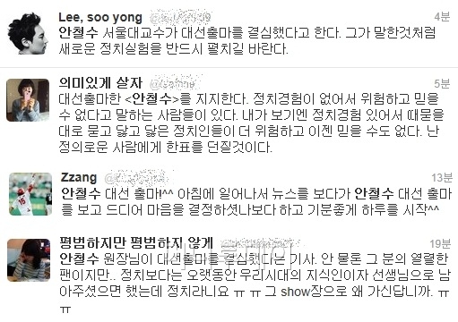또 '@mantoma***'는 "안철수 원장님이 대선출마를 결심했다는 기사. 물론 그 분의 열렬한 팬이지만.. 정치보다는 오랫동안 우리시대의 지식인이자 선생님으로 남아주셨으면 했는데 정치라니요. 그 show장으로 왜 가신답니까"라고 했고 '@seeu***'는 "안철수 아저씨 대선출마하지 말지.... 진짜 그 분 정치판에 끼면 안되는데...."라며 걱정스러워 하는 심정 드러냈다.
