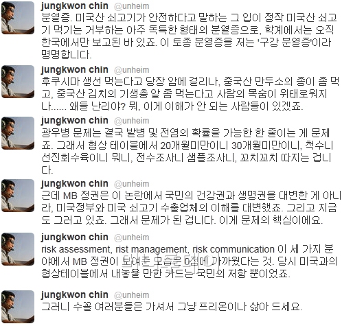 진중권 동양대 교수도 이날 트위터(@unheim)에서 "광우병 문제는 결국 발병 및 전염의 확률을 가능한 한 줄이는 게 문제죠. 그래서 협상 테이블에서 20개월 미만이니 30개월 미만이니, 척수니 선진회수육이니 뭐니, 전수조사니 샘플조사니, 꼬치꼬치 따지는 겁니다"면서 "MB 정권은 이 논란에서 국민의 건강권과 생명권을 대변한 게 아니라, 미국정부와 미국 쇠고기 수출업체의 이해를 대변했죠. 그리고 지금도 그러고 있죠"라고 지적했다.