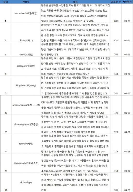 광우병 관련 가장 많은 리트윗을 기록한 상위 10개의 트윗을 살펴보면 보수 성향 트위터 이용자들의 약진이 눈에 띈다. 29일 기준으로 리트윗수 상위 10개 트윗 중 7개가 광우병 위험이 지나치게 과장됐다는 내용이었다.