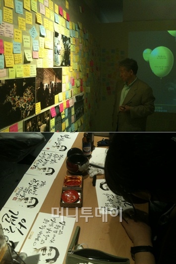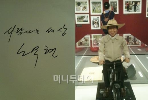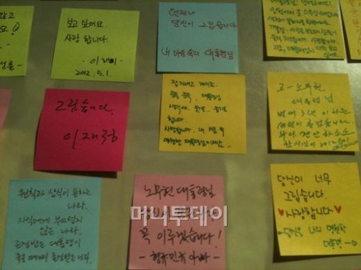 전시를 보고 나오면 한 쪽 벽면에 빼곡히 들어찬 '방문객들의 메시지'가 있다. "그립습니다-이재정" "보고싶어요. 사랑합니다- 이해미" "노무현 대통령님 당신이 꿈 꾼 나라 꼭 이루겠습니다-형규,민규 아빠" 등 노 전 대통령에게 보내는 '쪽지'들이 한 쪽 벽 가득하다.