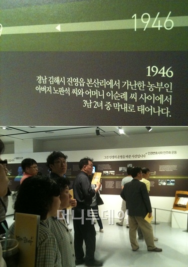 여느 전시와 달리 동선의 움직임이 매우 느리다. 진득하게 서서 노 전 대통령의 일대기를 꼼꼼하게 읽는 모습이 눈에 띈다. "아이고 진영이면 단감이 유명한데 여기서 태어나셨구나" 중년 여성 관람객들이 대화를 나눈다.