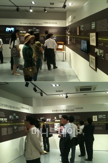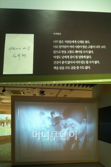 이쯤 발걸음을 옮기면 눈물을 닦는 이들을 어렵지 않게 볼 수 있다. 특히 노 전 대통령 서거 관련 전시에 다다라서는 오열하는 관람객도 있었다. 많은 이들이 눈시울을 붉히며 한 동안 발걸음을 떼지 못한다. '사람 사는 세상'이라는 노 전 대통령의 손 글씨를 사진으로 담아가는 이들이 많다. 또 노 전 대통령 생전 봉하 마을에서 친환경 농사를 지으며 "오시면 제가 안내하겠다"고 환하게 웃는 영상도 관람객들의 발길을 붙들어 놓는다.