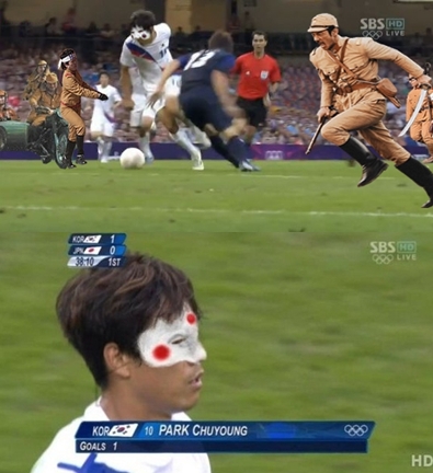 특히 박주영은 일본과의 동메달 결정전에서 4명의 수비수를 물리치고 선제골을 넣었다. 이에 박주영 주변의 일본 선수들은 일본 군인 사진으로 대체됐다.
