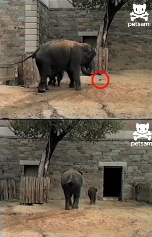 이후 다람쥐가 계속 접근하자 어미 코끼리는 다람쥐를 피해 네 발을 들었다 놨다를 반복하는 모습까지 보인다. 결국 견디지 못한 어미 코끼리는 아기 코끼리를 데리고 실내로 급하게 도망가는 모습을 보여 보는 이들을 웃음 짓게 했다.