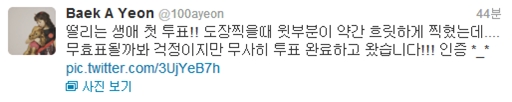 또 신인 가수 백아연(@100ayeon)이 "떨리는 생애 첫 투표 !! 도장 찍을 때 윗부분이 약간 흐릿하게 찍혔는데... 무효표 될까봐 걱정이지만 무사히 투표 완료하고 왔습니다!!!"라고 올렸다.