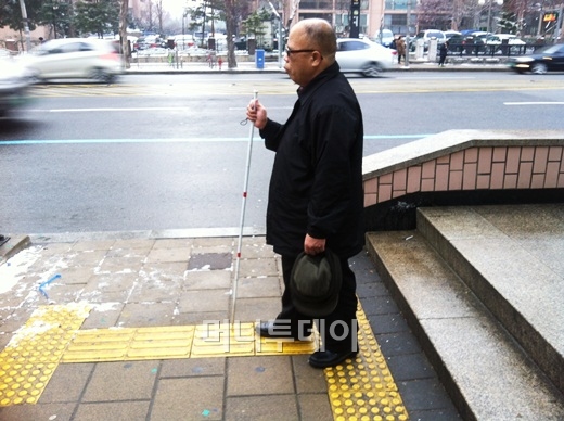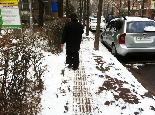 흰색 지팡이가 눈길을 가르며 이리저리 춤췄다. 지난 21일 오후 아침부터 내리던 진눈깨비가 눈으로 바뀌었다. 흰 눈밭 사이로 '탁탁' 소리에 맞춰 지팡이를 쥔 한 남성이 발을 옮겼다. 그는 지팡이로 보도 중간에 설치된 노란색 유도블록을 찾았다.