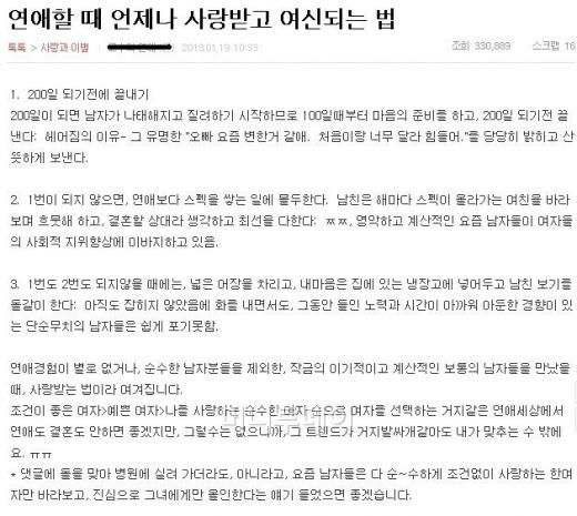 게시글에서는 "1. 사귄지 200일 되기 전에 헤어진다. 2. 1번이 되지 않으면, 연애보다 스펙을 쌓는 일에 몰두한다. 3. 1번도 2번도 되지 않을 때에는, 넓은 어장을 차리고, 남자보기를 돌같이 한다." 라는 내용을 담고 있어 네티즌의 관심이 모아졌다.