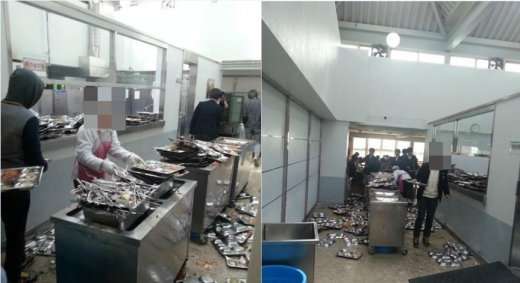 사진 속에서는 급식을 먹은 후 잔반처리를 제대로 하지 않은 식판과 수저가 단체급식소 바닥 여기저기에 널부러져 있고, 아주머니 혼자서 퇴식 처리를 하고 있다.