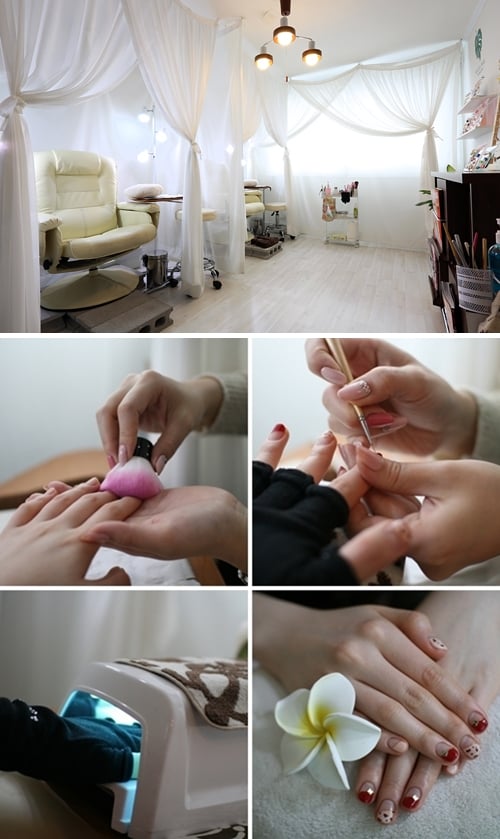 초인종을 누르면 대문이 열리고 환한 가정집 분위기의 내부가 펼쳐진다. 네일샵의 트레이드마크인 매니큐어 진열장과 기다란 테이블은 찾아 볼 수 없다. 대신 캐노피로 공간을 구분한 흰색 가죽 안락의자가 두 개 놓여있다.