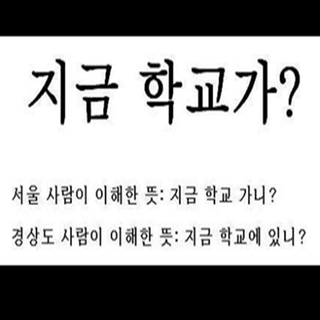 사진 속에서는 '지금 학교가?'라는 문구가 적혀있다. 해당 글을 '지금 학교 가니?'로 이해한 사람은 서울 사람, '지금 학교에 있니?'로 해석한 사람은 경상도 사람이다.