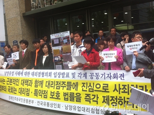 이날 기자회견엔 남양유업대리점협의회와 전국유통상인회, 전국편의점주단체, 진보정의당, 민주노총 등 각계 관계자가 참석했다. 지나가던 시민들도 발길을 멈추고 지켜보는 등 이번 사태에 대한 국민적인 관심을 드러냈다.