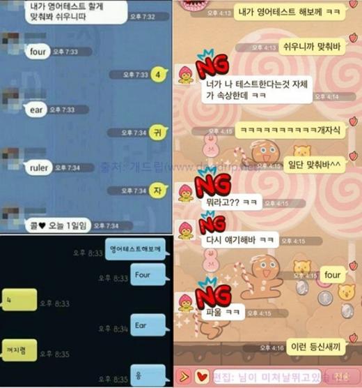 공개된 사진은 카카오톡 대화 화면을 캡처한 것으로 한 사람이 "내가 영어테스트 할 게 맞춰봐"라며 'four', 'ear', 'ruler' 하나씩 영어단어 문제를 냈다.